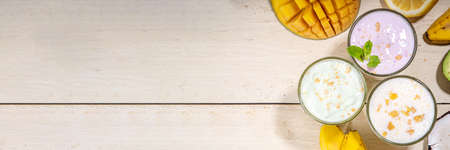 Refreshing yogurt, milkshakes or smoothies. Three glasses with fruit milkshakes. White banana, green apple avocado, yellow mango tropical fruits smoothie. On white wooden table, copy space