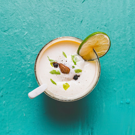 Top view of South Asian yogurt lassi with cardamom, a refreshing drink for kids