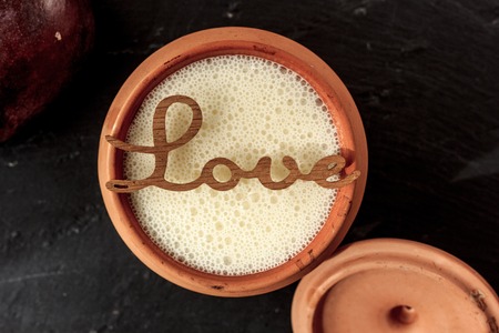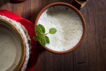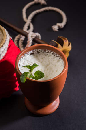 Lassie or lassi in terracotta glass - Lassi is an Authentic Indian cold drink made up of curd and milk and sugar, selective focus