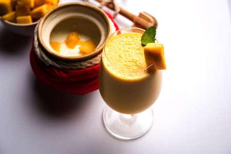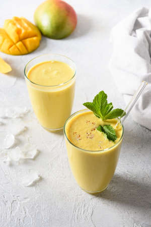 Lassi drink is smoothies or milkshake on light background. Traditional Indian and Pakistan drink with yogurt, mango, spices, mint and ice