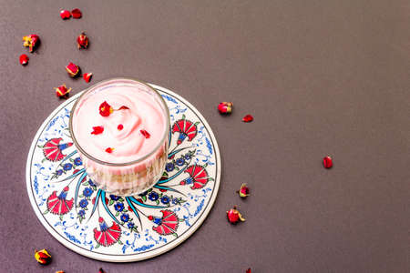 Delicate cream dessert. Traditional turkish edible rose, flower petals. Painted ceramics with a national pattern, stone concrete background, copy space