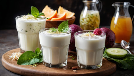 Refreshing mint yogurt drinks served in clear glasses with green leaves in the background during a bright day