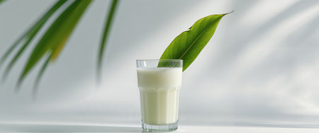 AI Generated. Fresh coconut juice in glass and coconut green leaf