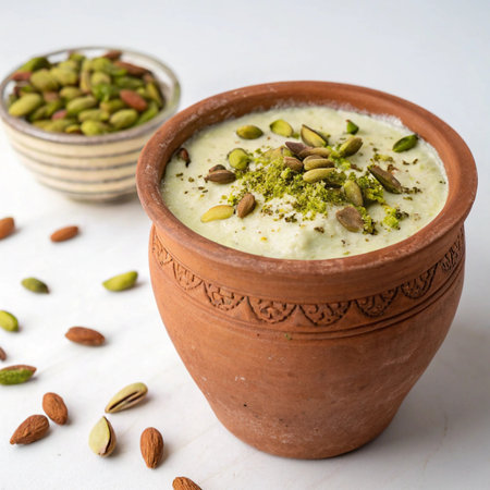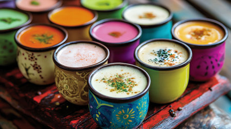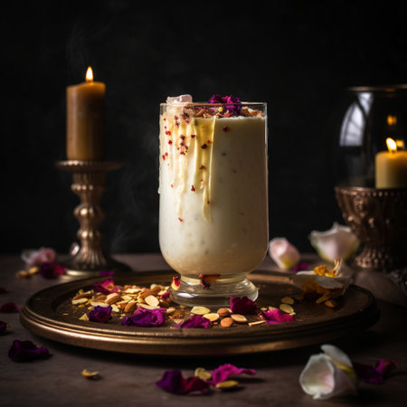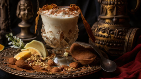 Indulge in the creamy and frothy texture of this traditional Indian drink, the thandai. Made from a blend of milk, nuts, and spices such as cardamom, saffron, and rose petals, this sweet and spicy drink is perfect for a comforting evening. The aroma is warm and comforting, with a hint of spices that will transport you to India. The thandai is served with a small spoon and garnished with a sprinkle of rose petals or nuts, which adds a beautiful touch to the overall presentation. Pair this delicious drink with your favorite sweets and savor the taste of India.