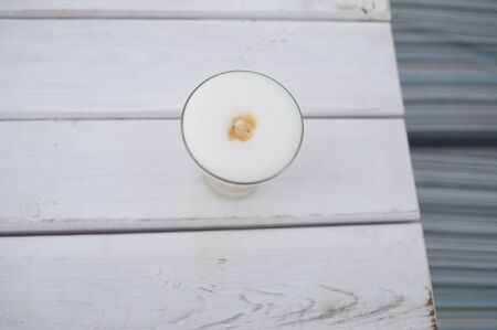 Sun terrace cafe with a latte in a glass on the table. Tall glass of latter coffee on a table in ourdoor area next to swimming pool. A cup of coffee, latte on a wooden table in a coffee house.