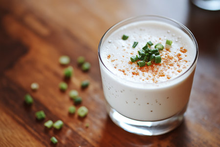 Scallion Latte with Fresh Chopped Green Onions on Wooden Table - Unique Beverage Concept for Culinary Enthusiasts.