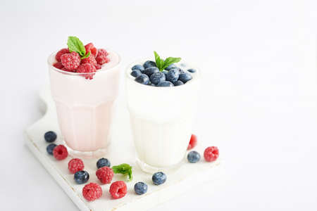 Yogurt cocktail and parfait. Natural detox. Liquid ice cream. Healthy food and breakfast. Good morning. Berry Milk Smoothie with blueberries, strawberries, raspberries. Fresh diet dessert. Summer card