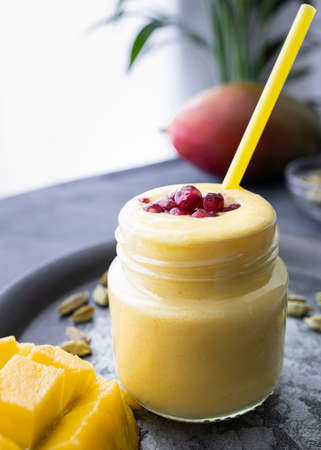 Lassi, traditional Indian drink, commanding with pomegranate seed toppings. Delicious mango and coconut yogurt smoothie with turmeric and cardamom. Food photography