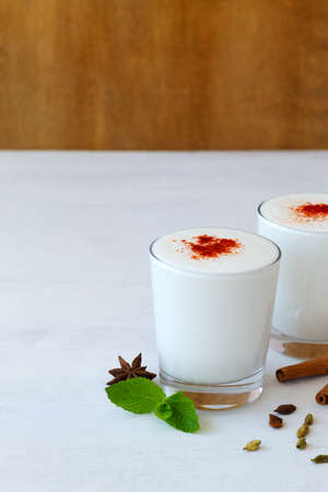 Lassi drink with red pepper and fresh green mint on white background. Kefir, yogurt or milk with probiotics on the table. cold dairy with spices: cinnamon and star anise. Indian cuisine. copy space.