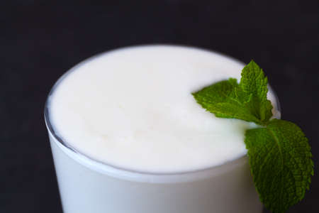 glass of milk. close-up Lassi drink with fresh green mint on black. cold dairy. Indian cuisine. copy space. ayran, yogurt with probiotics on the white table. healthy, fermented products concept.