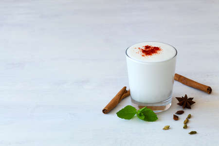 glass of milk.dessert, yogurt with probiotics on the table.Lassi drink with red pepper and fresh green mint on white. cold dairy with spices: cinnamon and star anise. Indian cuisine. copy space