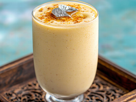 A refreshing glass of mango lassi, a popular Indian yogurt-based drink, served chilled and garnished with a sprinkle of cardamom