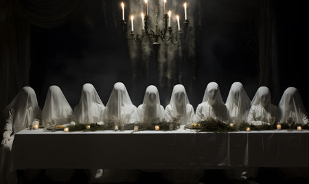 A vertical shot cary white ghost in the dark room during ceremony
