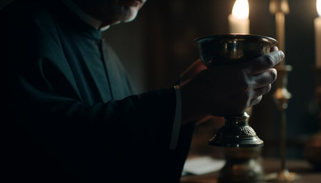 Closeup of wrinkled hand of unrecognizable senior priest standing in front of altar in Catholic church taking cup of wine