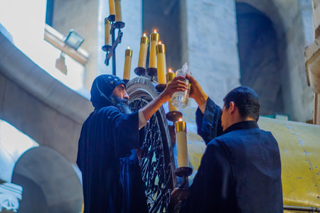 Jerusalem, Israel - April 30, 2021: Coptic priests lighting oil candles, on Orthodox Good Friday, in the Holy Sepulchre church, Jerusalem Old City, Israel
