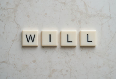 A close-up image of letter tiles spelling the word WILL on a marbled surface. Ideal for concepts of decision-making, future planning, and motivation.