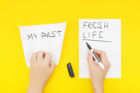 Hand wrinkles a piece of paper with the phrase: My past, and writes on a blank sheet of paper: Fresh life. The concept of recognition mistakes of past and the start of life from scratch.