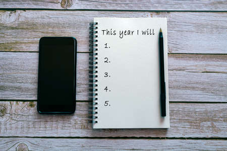 This year I will text on notepad on wooden background with smartphone and pen. New year's resolutions concept.