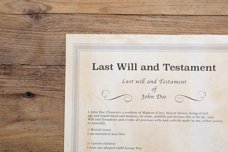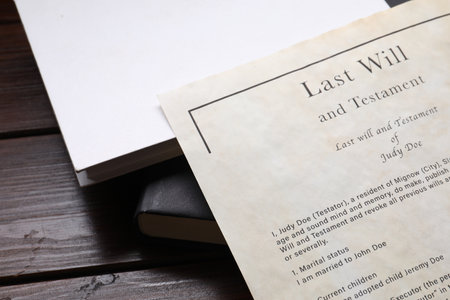 Last Will and testament document on wooden table close up