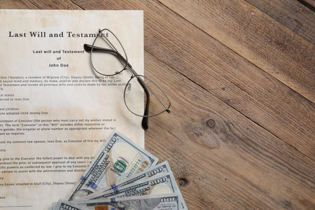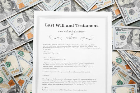 Last Will and Testament with dollar bills, top view