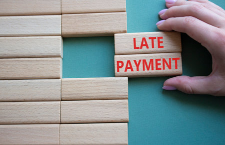 Late payment symbol. Concept word Late payment on wooden blocks. Beautiful gray green background. Businessman hand. Business and Late payment concept. Copy space