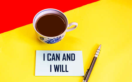 I can and will i word written on a sticker with a cup of coffee and a pen