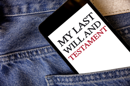 Conceptual hand writing showing My Last Will And Testament. Business photo text List of things to be made after his or her death Cell phone white screen message application wicker background