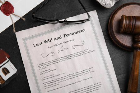 Last will and testament near house model, glasses, gavel on black table, flat lay