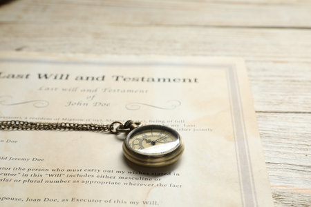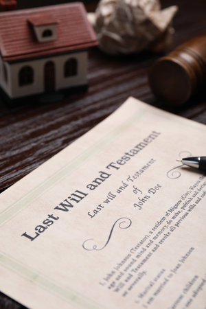 Last Will and testament document on wooden table close up