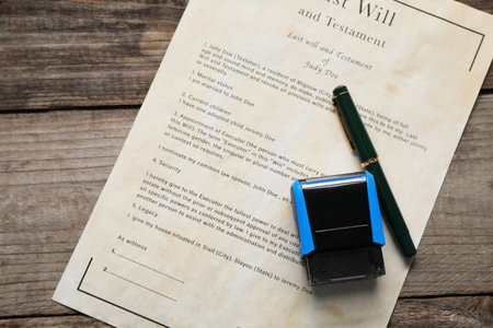 Last Will and Testament with fountain pen and stamp on wooden table, top view