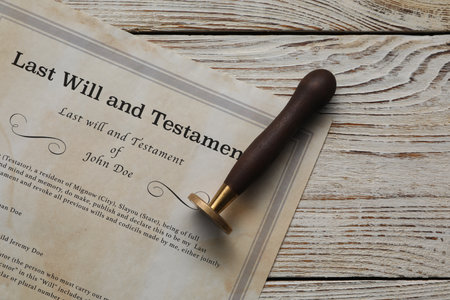 Last Will and Testament with wax stamp on wooden table, top view