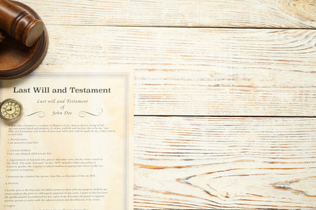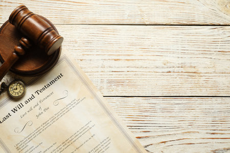 Last Will and Testament text on Document and gavel isolated on office desk. Law concept