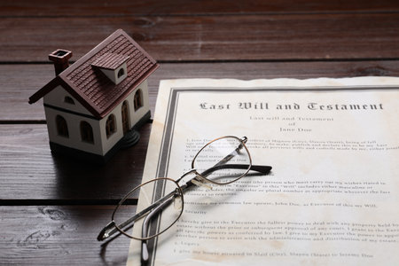 Last Will and Testament, house model and glasses on wooden table, closeup