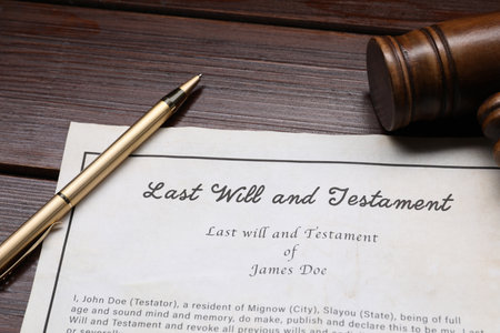 Last Will and Testament with gavel and pen on wooden table, closeup