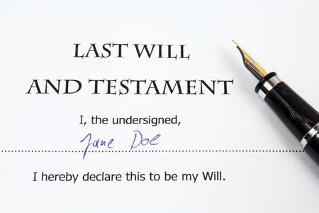 Last Will and Testament with a fictitious name and signature. Document and fountain pen.