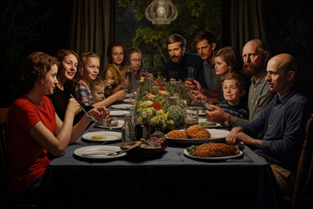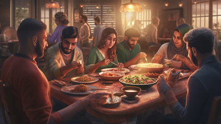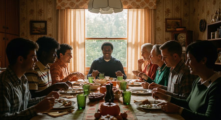 A cozy family dinner scene with warm lighting, featuring plates of food on table and people enjoying meal together