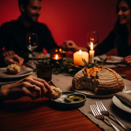 Rustic Feast with Friends. Sharing a Delicious Meal, Bread, Wine and Enjoy a Candlelit Dinner.