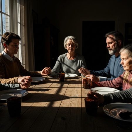 Family holding hands around dinner table, heads bowed in quiet gratitude; harsh sunlight and shadows