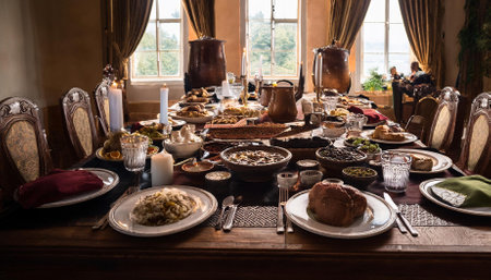 Table served for Thanksgiving dinner in traditional English style. Selective focus.