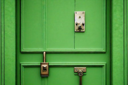Large light green front door of house with handles and locks