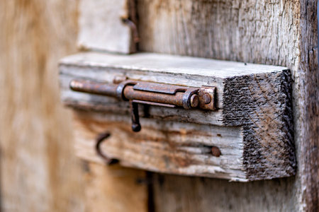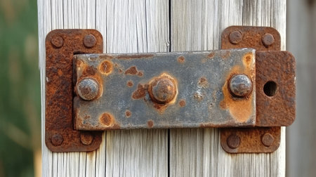 A close-up view of a rusty metal latch on a weathered wooden post, highlighting the textures of rust and aged wood. Ideal for conveying decay and vintage elements.