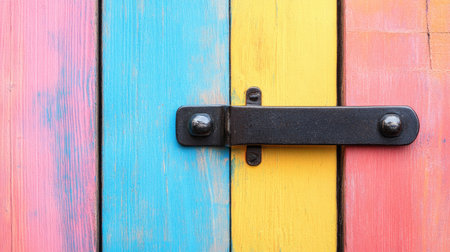 A vibrant image of a colorful wooden door featuring a sturdy metal locking mechanism. This artwork captures the essence of craftsmanship and creativity in design.