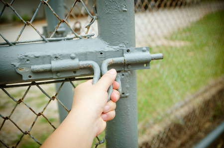 Hands are open bolt, steel mesh fence.