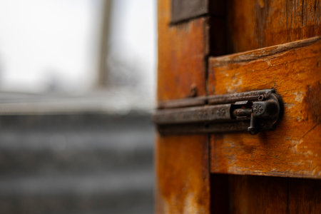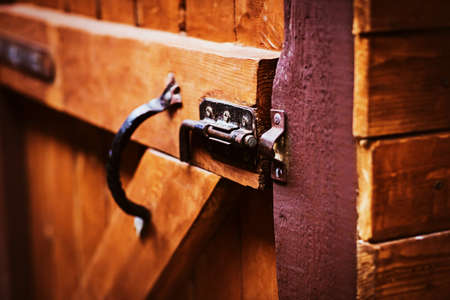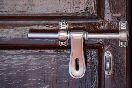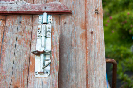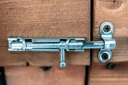 Latch on a wooden door. Metal lock