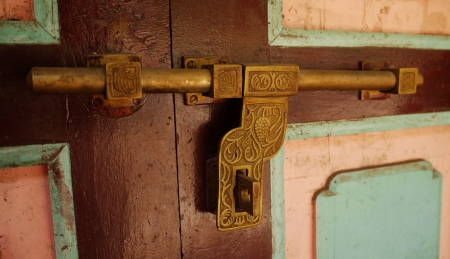 Forged latch on the door of a house in the mountains of the Himalayas