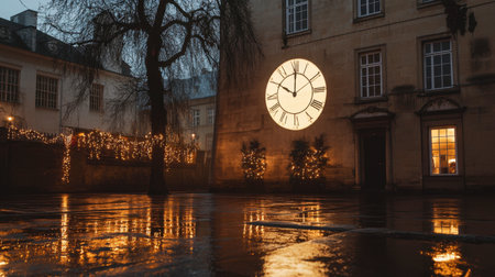 The clock glows softly, its hands approaching a specific hour, highlighting tranquility