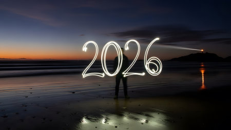 2026 light painting on a beach at sunset with a distant lighthouse. Clear details and vibrant col...