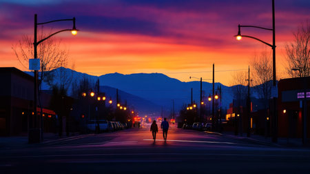 A captivating image of a couple walking down a city street at sunset, with streetlights illuminating the way.