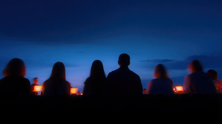 Silhouettes of people gather on a bridge during sunset, creating a serene scene against a fading blue sky transitioning to warm hues.