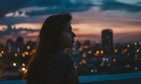 Silhouette of a beautiful girl on the roof against the background of the city.